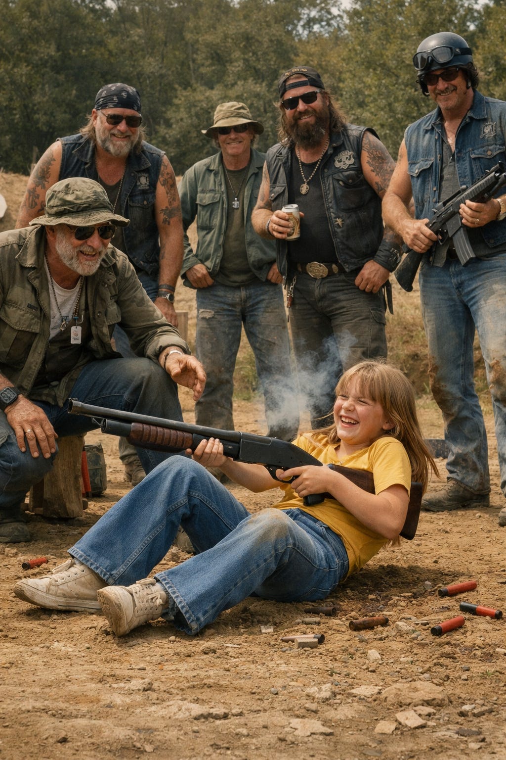 Summer air sticky with gasoline and gunpowder. Gravel crunching under my small feet as I held my father’s hand, trying to keep up. Motorcycles hummed nearby. A group of men—Vietnam vets, leather jackets creaking, tattoos snaking up their arms—lingered by the targets. Scary to most. Heroes to me.